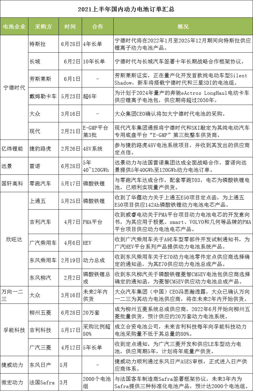 以下为2021上半年动力电池订单汇总: