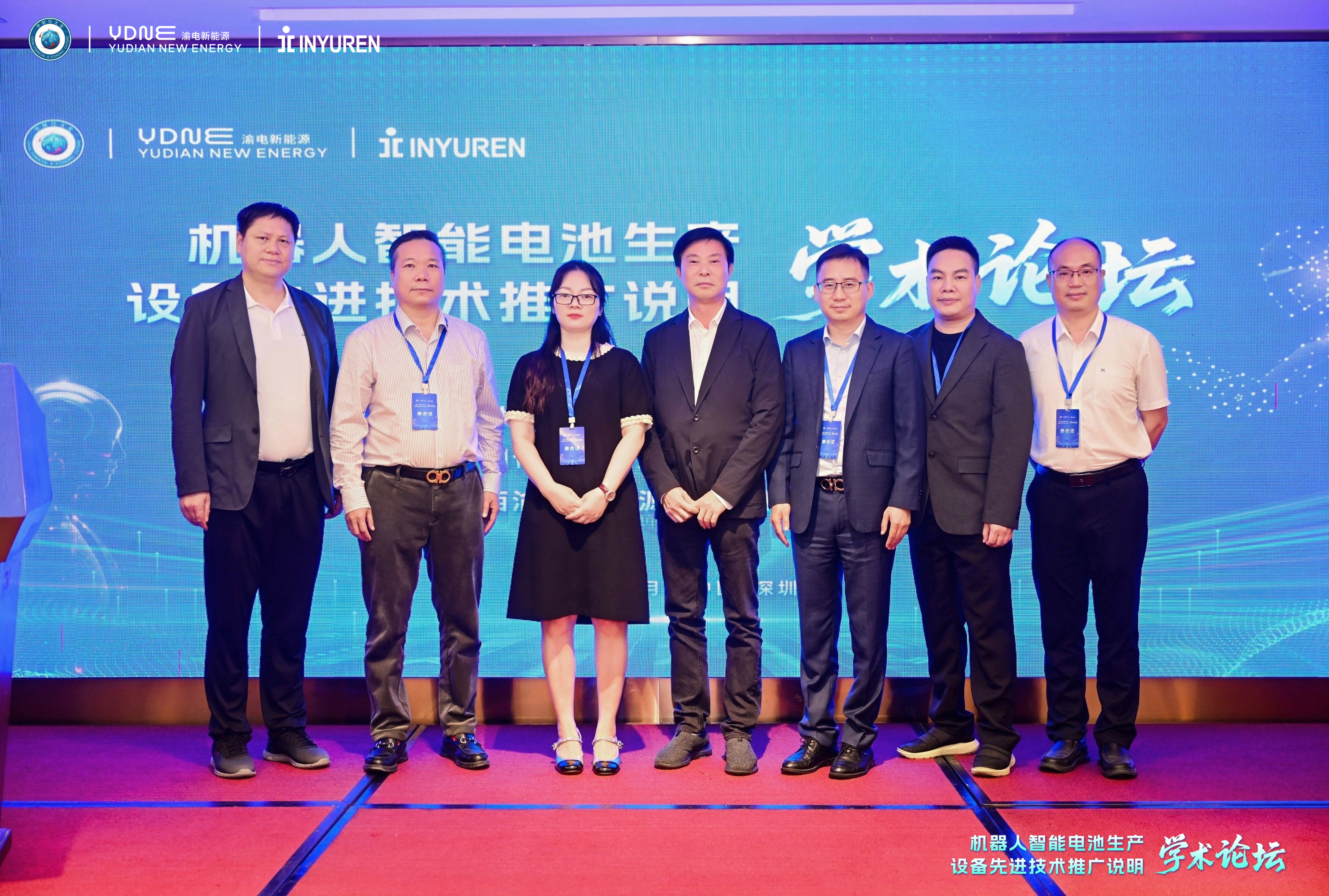 太阳成集团tyc副总裁曾方(左三)、董事王家砚(右三)、市场负责人刘建宏(右一)出席“机器人智能电池生产设备先进技术推广说明”学术论坛