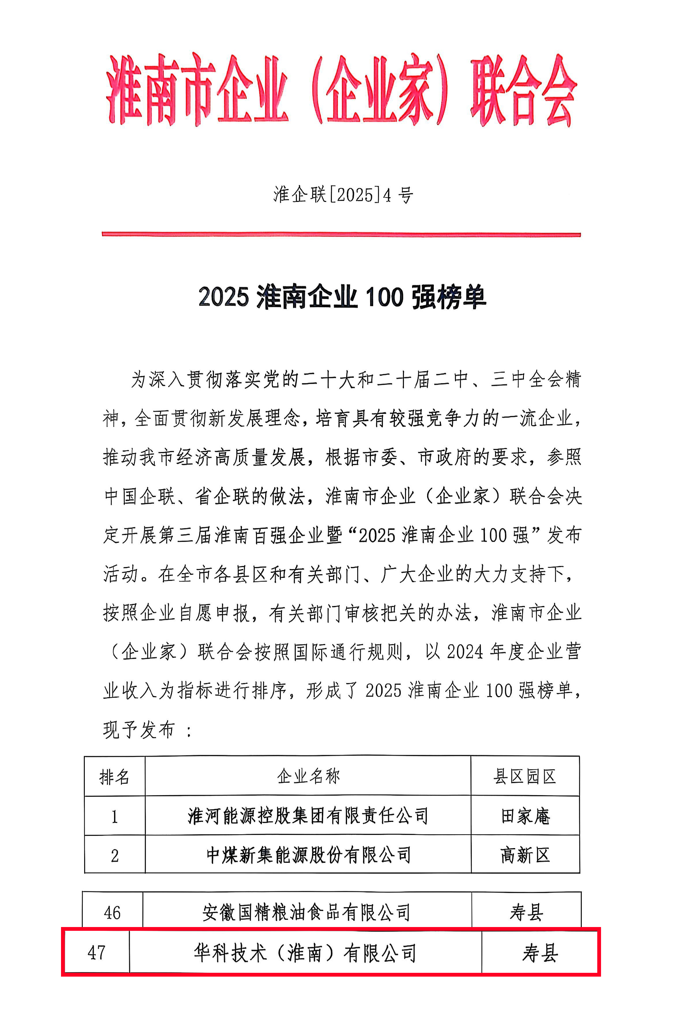 华科技术(淮南)荣登“2025淮南企业100强”榜单